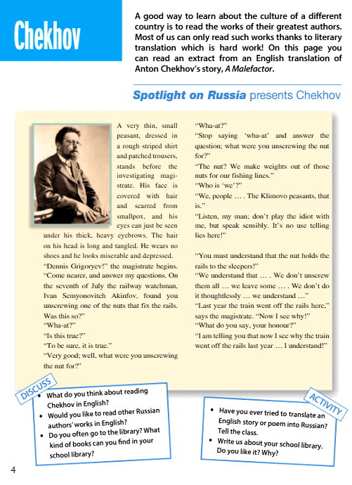 Хороший способ познакомиться с культурой другой страны – прочитать произведения ее величайших авторов. Большинство из нас может читать такие произведения только в литературном переводе, а это нелегкий труд! На этой странице вы можете прочитать отрывок из рассказа Антона Чехова «Злоумышленник» в переводе на английский язык.
