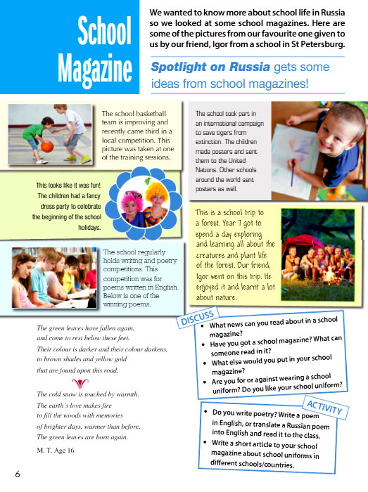 Мы хотели побольше узнать о школьной жизни в России, поэтому просмотрели несколько школьных журналов. Вот несколько фотографий из нашего любимого журнала, который нам подарил наш друг Игорь из школы в Санкт-Петербурге.