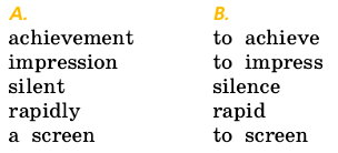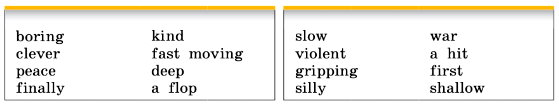 1) A moving story; 2) gripping events; 3) a deep impression; 4) an actor’s playing; 5) violent behaviour; 6) a waste of time; 7) an important idea; 8) a shallow answer.