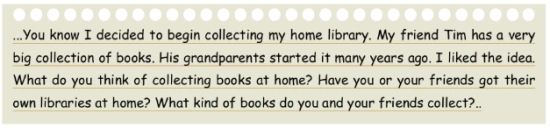 …Знаешь, я решил начать собирать домашнюю библиотеку. У моего друга Тима очень большая коллекция книг. Его бабушка и дедушка начали это много лет назад. Мне понравилась идея. Что ты думаешь о коллекционировании книг дома? Есть ли у тебя или твоих друзей дома собственная библиотека? Какие книги коллекционируешь ты или твои друзья? …