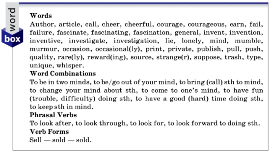 Author (автор), article (статья), call (вызов), cheer (развеселить), cheerful (веселый), courage (смелость), courageous (смелый), earn (заработать), fail (потерпеть неудачу), failure (неудачу), fascinate (очаровать), fascinating (увлекательный), fascination (увлечение), general (общий), invent (изобрести), invention (изобретение), inventive (изобретательный), investigate (исследовать), investigation (исследование), lie (ложь), lonely (одинокий), mind (ум), mumble (бормотать), murmur (бормотать), occasion (случай), occasional(ly) (случайный(о)), print (печать), private (личное), publish (публикация), pull (вытягивание), push (нажатие), quality (качество), rare(ly) (редкий(о)), reward(ing) (вознаграждать(ющий)), source (источник), strange(r) (странный(незнакомец)), suppose (предположить), trash (мусор), type (тип), unique (уникальный), whisper (шепот).