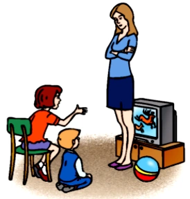 На картине дети смотрят телевизор, а женщина пытается привлечь их внимание. Она обеспокоена, потому что они смотрят уже слишком долго. Проводить много времени перед телевизором — это нехорошо: дети мало двигаются, у них устают глаза, и они могут увидеть насилие на экране. Это влияет на их здоровье и поведение. Телевизор также может усложнить общение в семье. Нужно ограничивать время, проведённое перед экраном, и выбирать программы вместе с родителями.