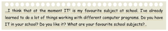 Thank you for your letter! Yes, we have IT at my school, and I like it a lot. It’s interesting to learn how to use different computer programs, and I think these skills will be useful in the future. My favourite subjects are Literature and History. I enjoy Literature because I like reading books. History is also very exciting because I like learning about the past and how people lived long ago. Do you have any favourite subjects besides IT? What do you like to do in your free time? I’m looking forward to your reply!