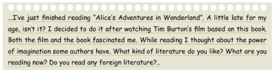 …Я только что дочитала «Алису в стране чудес». Немного поздно для моего возраста, не так ли? Я решил это сделать после просмотра фильма Тима Бертона по этой книге. И фильм, и книга меня очаровали. Читая, я думал о силе воображения некоторых авторов. Какая литература вам нравится? Что вы сейчас читаете? Читаете ли вы какую-нибудь зарубежную литературу?…