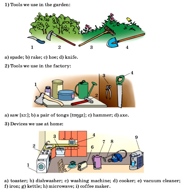 (2-c. hoe – мотыга) - This tool is used for digging earth or sand. It is usually made of metal and has a handle often made of wood. The metal part is pushed into the ground with the foot. – Этот инструмент используется для копания в земле или песке. Обычно он сделан из металла и имеет деревянную рукоятку. Металлическую часть втыкают в землю ногой.