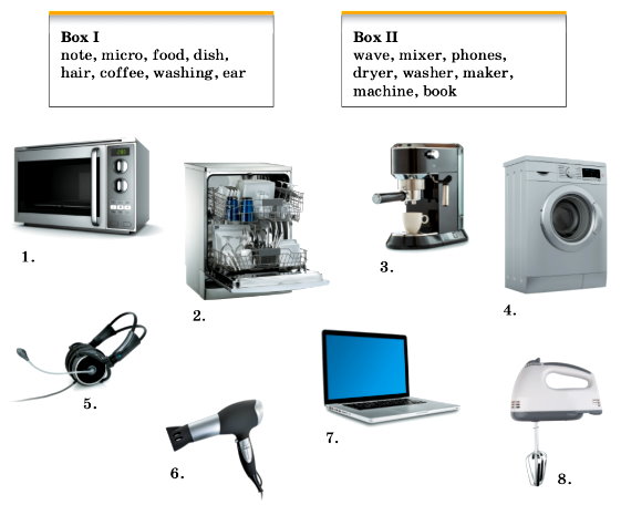 wave (волна), mixer (миксер), phones (телефоны), dryer (сушилка), washer (мойщик), maker (производитель), machine (машина), book (книга)