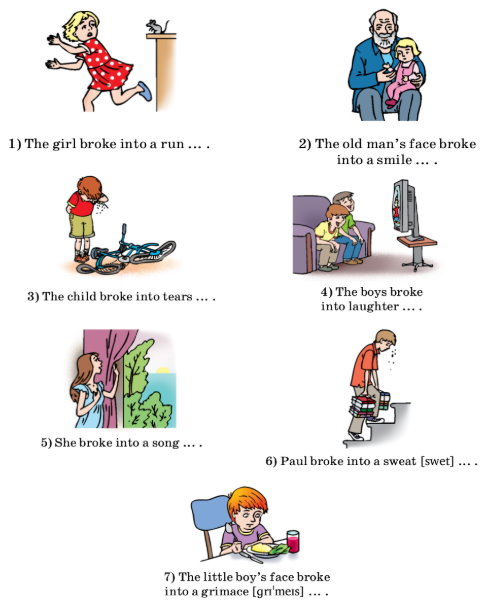 6) Paul broke into a sweat because he was carrying heavy books upstairs. – Пол вспотел, потому что он нес наверх тяжелые книги.