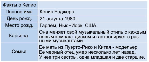 - Kelis became interested in music in her childhood. – (True) – Келис увлеклась музыкой еще в детстве.