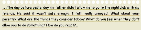 … Позавчера отец не разрешил мне пойти в ночной клуб с друзьями. Он сказал, что это недостаточно безопасно. Я чувствовал себя очень раздраженным. Как насчет твоих родителей? Какие вещи они считают табу? Что вы чувствуете, когда вам не позволяют делать то или иное? Как вы реагируете?…