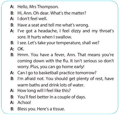 B: Hmm. You have a fever, Ann. That means you’re coming down with the flu. It isn’t serious so don’t worry. Plus, you can go home early! – Хм. У тебя жар, Энн. Это значит, что ты подхватила грипп. Ничего серьезного, не волнуйся. К тому же ты можешь уйти домой пораньше!