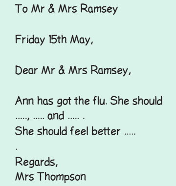 Уважаемые мистер и миссис Рэмси, Энн заболела гриппом. Она должна много отдыхать, принимать теплые ванны и пить много воды. Через пару дней ей должно стать лучше. С уважением,