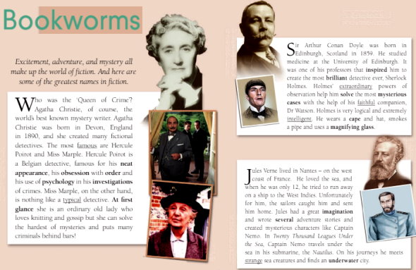 На картинках вы видите Эркюля Пуаро и мисс Марпл, созданных Агатой Кристи, Шерлока Холмса, созданного сэром Артуром Конан Дойлем, и капитана Немо, созданного Жюлем Верном. Эти авторы написали замечательные истории. Их герои очень умны и отважны, и все они способны решать сложные задачи и противостоять опасностям.