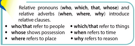 Relative pronouns (who,which,that, whose) and relative adverbs (when, where, why) introduce relative clauses. − Относительные местоимения (кто, который, что, чей) и наречия (когда, где, почему) составляют определительные придаточные предложения.