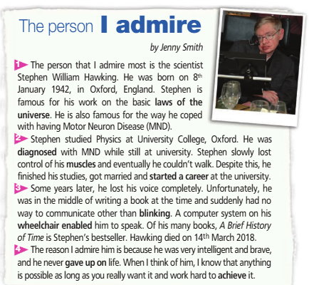 - Больше всего я восхищаюсь ученым Стивеном Уильямом Хокингом. Он родился 8 января 1942 года в Оксфорде, Англия. Стивен был известен своей работой по основным законам Вселенной. Он также был известен тем, как справляется с болезнью двигательных нейронов (БДН).