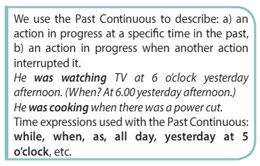 He was watching TV at 6 o’clock yesterday afternoon. (When? At 6.00 yesterday afternoon.) He was cooking when there was a power cut. – Он смотрел телевизор вчера в 6 часов вечера. (Когда? Вчера в 6 часов вечера). Он готовил, когда отключилось электричество.