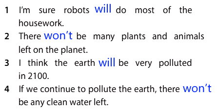 John: I think the world will be a very different place in 2100. I’m sure that robots will do most of the housework for us so we can spend more time playing and having fun. But, I think there won’t be many plants and animals left on the planet so we’ll have to find new types of food. I also think the earth will be very polluted and maybe we’ll have to wear masks. What I’m really afraid of is that if we continue to cause pollution, there won’t be any clean water left and we’ll have to go to other planets to find water.