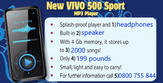 You’ll never be alone with the new VIVO 500 MP3 player. This is the MP3 player you’ve been waiting for. The new VIVO 500 with its splash-proof player and headphones means you can take it to the beach or the swimming pool this summer and not worry about water. Its built-in speaker means you can share your music with your friends and not just a few songs. No, this player can store up to two thousand songs. And all for one hundred and ninety-nine pounds. It’s the best in MP3 technology: small, light and easy to carry. Get your own VIVO 500 now. For information call 0800 755 844.
