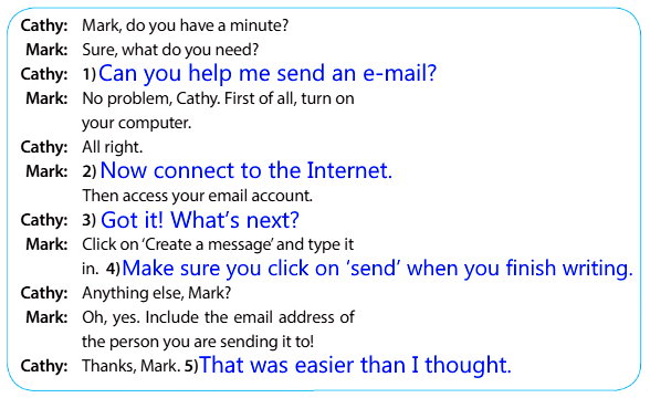 - Cathy: 1) Can you help me send an e-mail? − Ты не мог бы помочь мне отправить е-мейл?