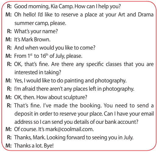 B: Oh hello! I’d like to reserve a place at your summer camp, please. − Здравствуйте! Я хочу зарезервировать место в вашем летнем лагере, пожалуйста.