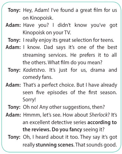 Adam: Hmmm, let’s see. How about Sherlock? It’s an excellent detective series according to the reviews. Do you fancy seeing it? − Хммм, давай посмотрим. Как насчет «Шерлока»? Судя по отзывам, это отличный детективный сериал. Не хочешь посмотреть?