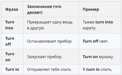 Слово TURN как волшебная палочка. К нему нужно добавить правильное словечко (on, off, in, into), чтобы получилось нужное заклинание!