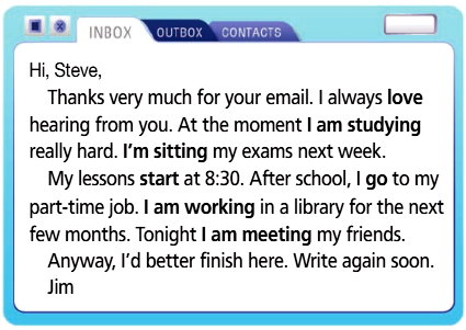 Hi Steve, Thanks very much for your e-mail. I always love hearing from you. At the moment I am studying really hard. I’m sitting my exams next week. My lessons start at 8:30. After school, I go to my part-time job. I am working in a library for the next few months. Tonight I am meeting my friends. Anyway, I’d better finish here. Write again soon. Jim