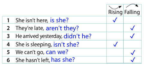 - She hasn’t left, has she? − Она ведь не уехала, так ведь? (интонация понижается / говорящий уверен)