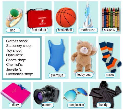 A: OK. Let’s go to the sports shop. − Хорошо. Давай пойдём в спортивный магазин.