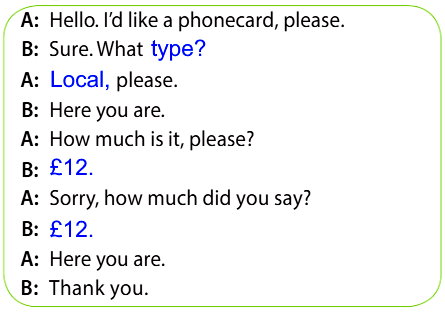 A: Hello. I’d like a phonecard, please. − Здравствуйте. Я хотела бы купить телефонную карточку, пожалуйста.