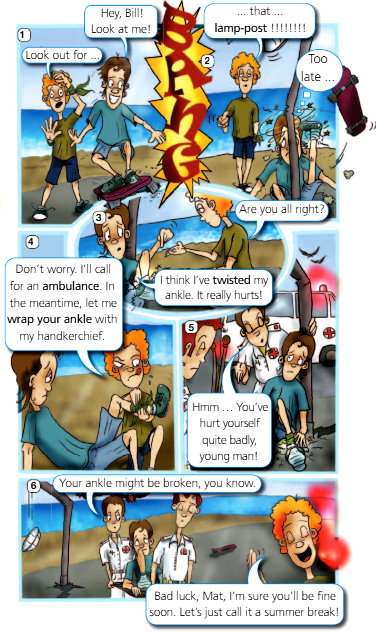 − I think I’ve twisted my ankle. It really hurts! − Думаю, я вывихнул лодыжку. Как же больно! - − Don’t worry. I’ll call for an ambulance. In the meantime, let me wrap your ankle with my handkerchief. − Не волнуйтесь. Я вызову скорую. А пока давайте я перевяжу вам лодыжку своим платком.